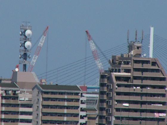 うちのマンション最上階から100mマンションのJCC-300とF岡造船のクレーンを見てみました。
