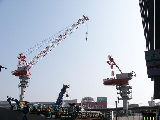 博多駅前、右に組み立て中のIHI JCC-V720Sの愛称はやはりJR九州らしく「かもめ」となっています。